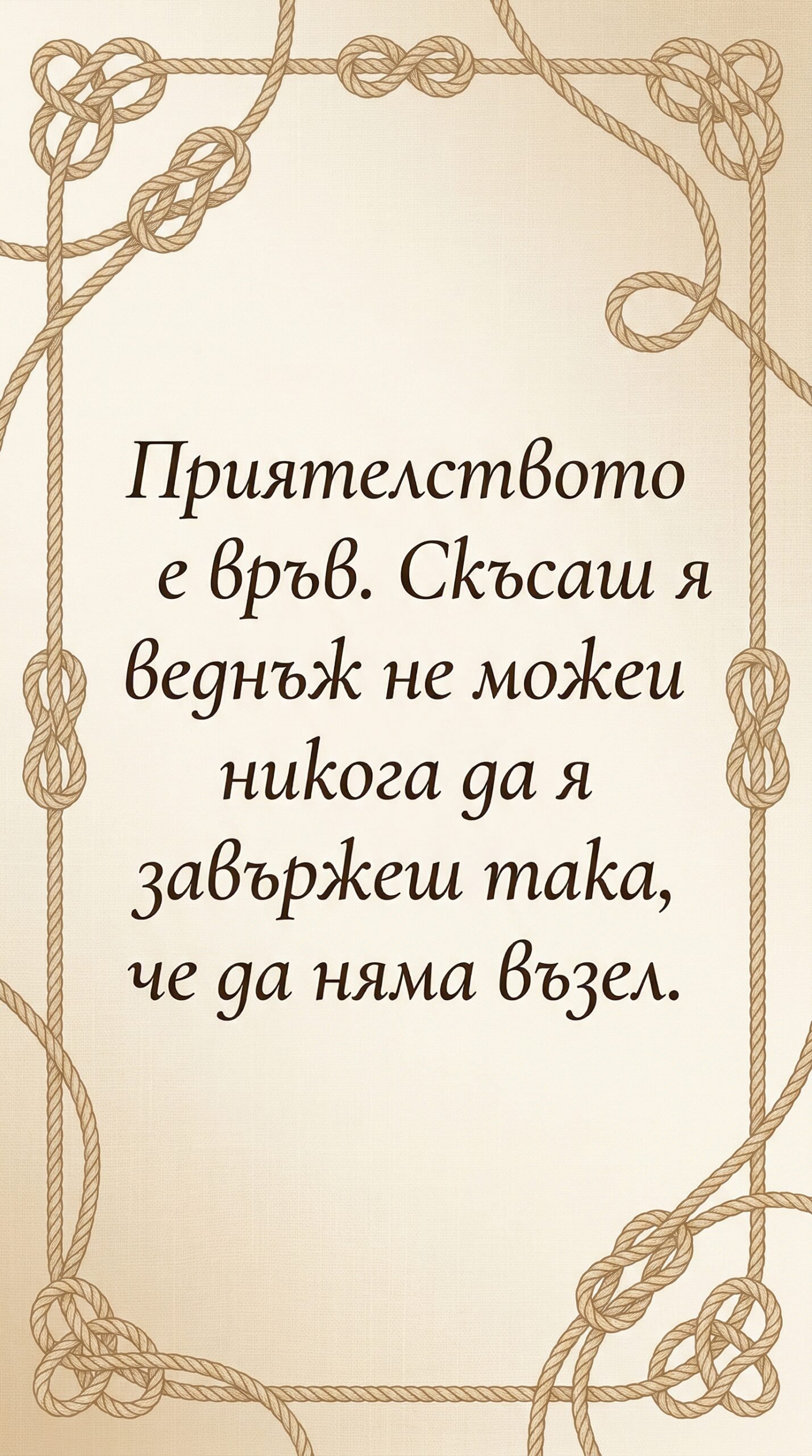 Веднъж счупено приятелство оставя следа “Приятелството е връв. Скъсаш ли я веднъж не можеш никога да я завържеш така, че да няма възел.” Facebook Twitter Pinterest Messenger WhatsApp Viber