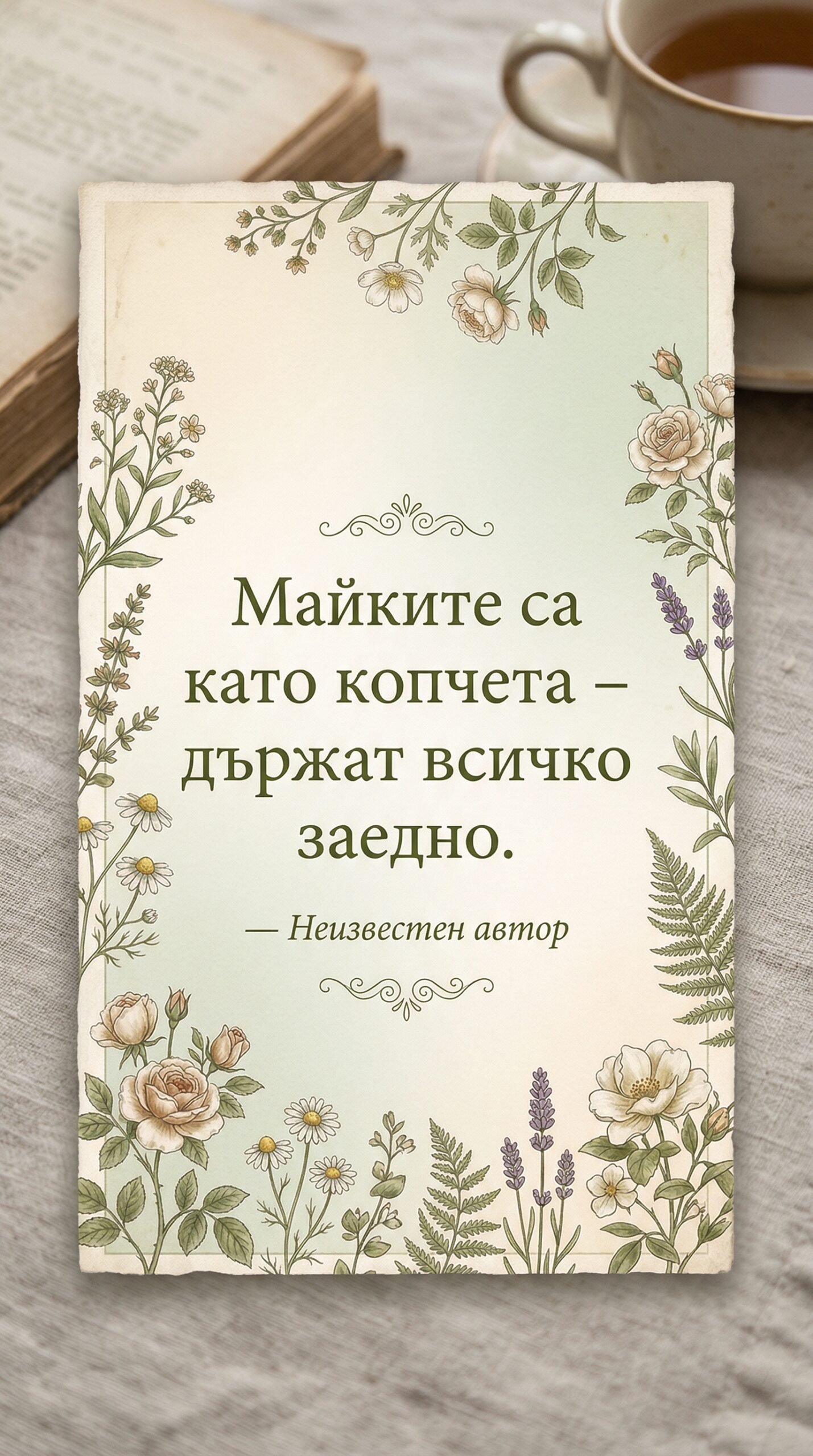 Майката държи всичко заедно Майките са като копчета – държат всичко заедно.— Неизвестен автор Facebook Twitter Pinterest Messenger WhatsApp Viber