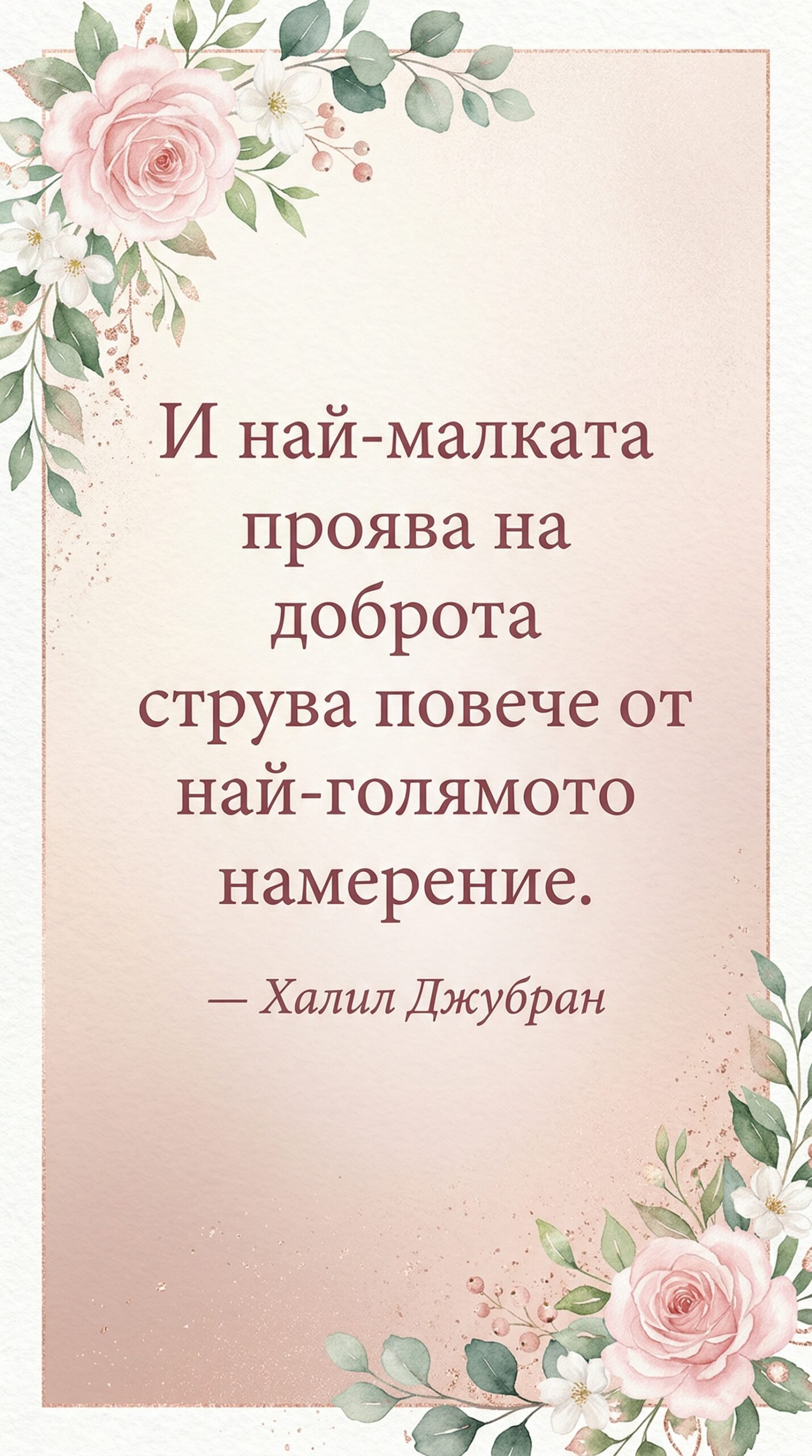 Малката доброта има голяма стойност „И най-малката проява на доброта струва повече от най-голямото намерение.“ – Халил Джубран Facebook Twitter Pinterest Messenger WhatsApp Viber