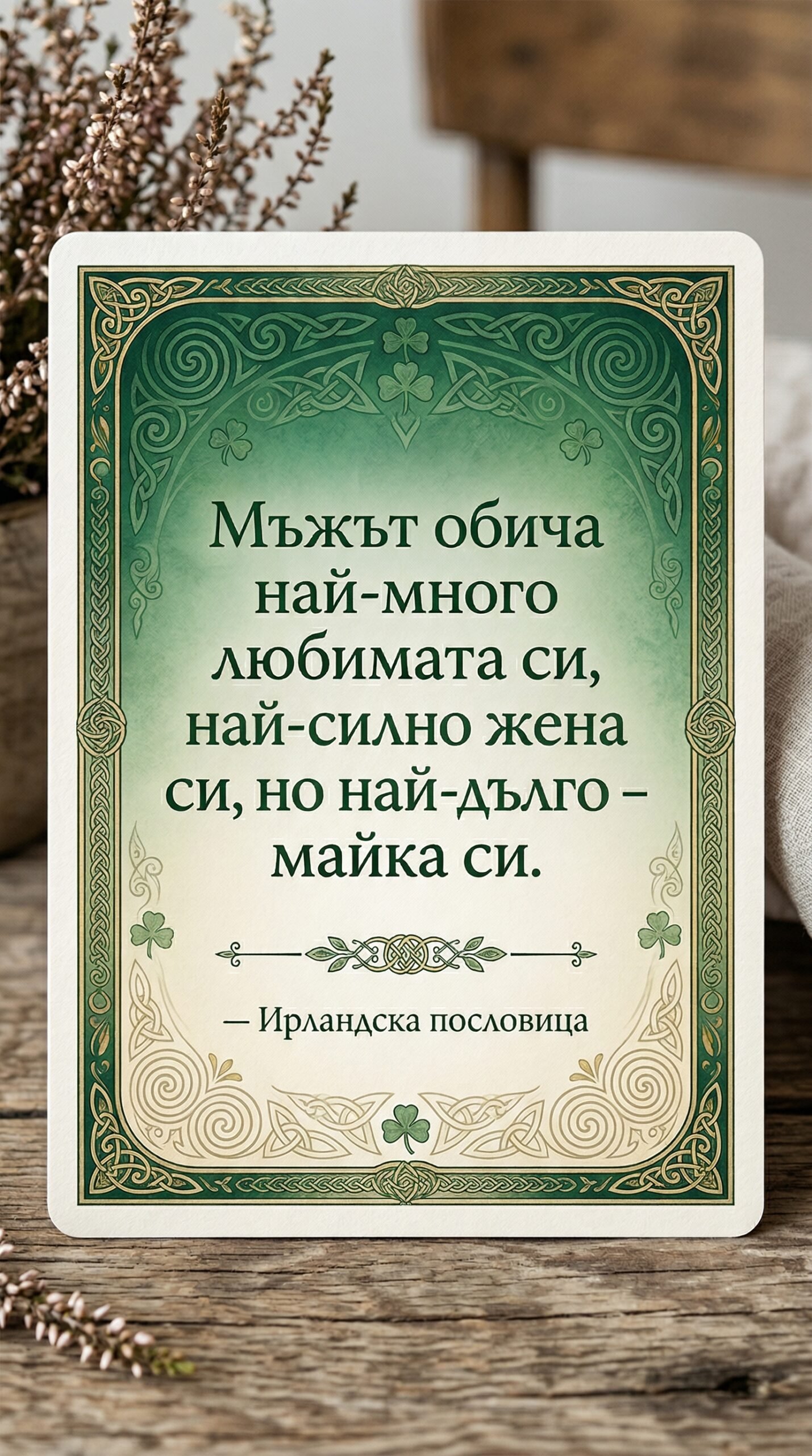 Най-дългата любов Мъжът обича най-много любимата си, най-силно жена си, но най-дълго – майка си.— Ирландска пословица Facebook Twitter Pinterest Messenger WhatsApp Viber